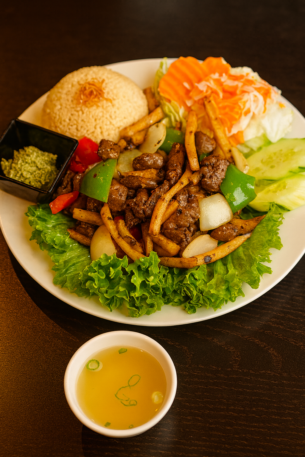 Filet Mignon Shaken Beef with Fries over Rice: $24.95